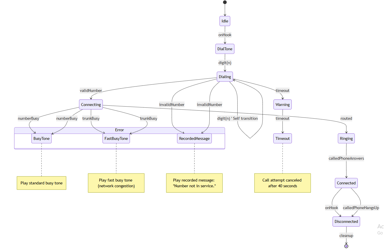 This Telephony Call Control System state machine is a real-world example of how UML can model complex, event-driven systems with high reliability.