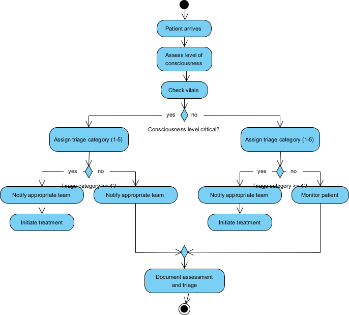 Unlike informal notes or verbal handoffs, a properly structured Activity Diagram ensures traceability. Each node can be linked to policies, staff roles, equipment availability, and compliance standards (e.g., CMS or Joint Commission guidelines). This enables auditors to validate that decisions were made in accordance with protocol, and managers to identify bottlenecks or redundancy across shifts.