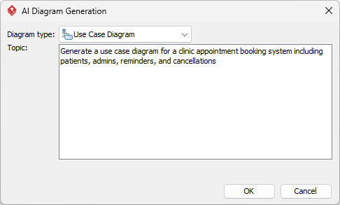 - In the AI prompt area, describe your scenario: e.g., “Generate a use case diagram for a clinic appointment booking system including patients, admins, reminders, and cancellations.”