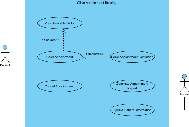 Entering the scene, we recommended starting with an AI-generated use case diagram to model the ideal booking system. By inputting a natural language description of their processes into Visual Paradigm Desktop’s AI feature, they quickly produced a diagram outlining actors like patients, admins, and the system itself, with use cases such as “Schedule Appointment,” “Confirm Booking,” and “Send Automated Reminder.”
