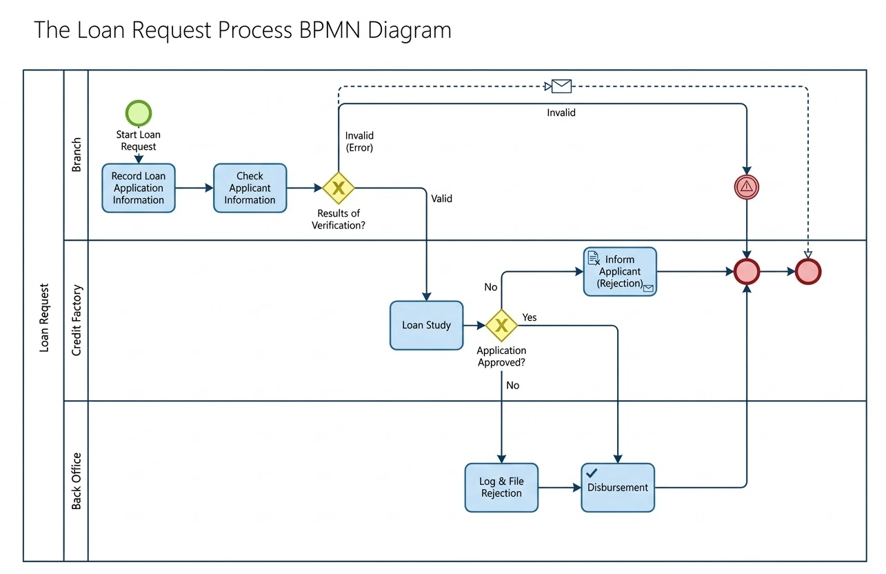 Quy trình yêu cầu vay của Ngân hàng Apex là một ví dụ tiêu biểu về cách màBPMN 2.0có thể được tận dụng để mô hình hóa các quy trình tài chính phức tạp với độ rõ ràng, tuân thủ và khả năng mở rộng. Cấu trúc sạch sẽ, luồng logic và tuân thủ các tiêu chuẩn khiến nó trở thành nền tảng mạnh mẽ cho chuyển đổi số.