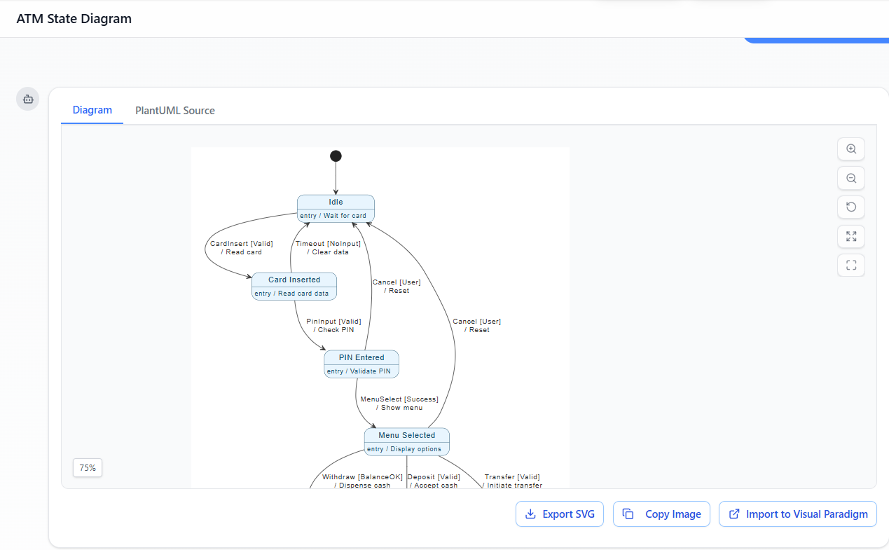 Khi kết thúc, bạn sẽ có mộtsơ đồ máy trạng thái ATM hoàn toàn có thể truy xuất nguồn gốc, sinh mã được và dễ bảo trì— tất cả được xây dựng với nỗ lực tối thiểu và độ chính xác tối đa.